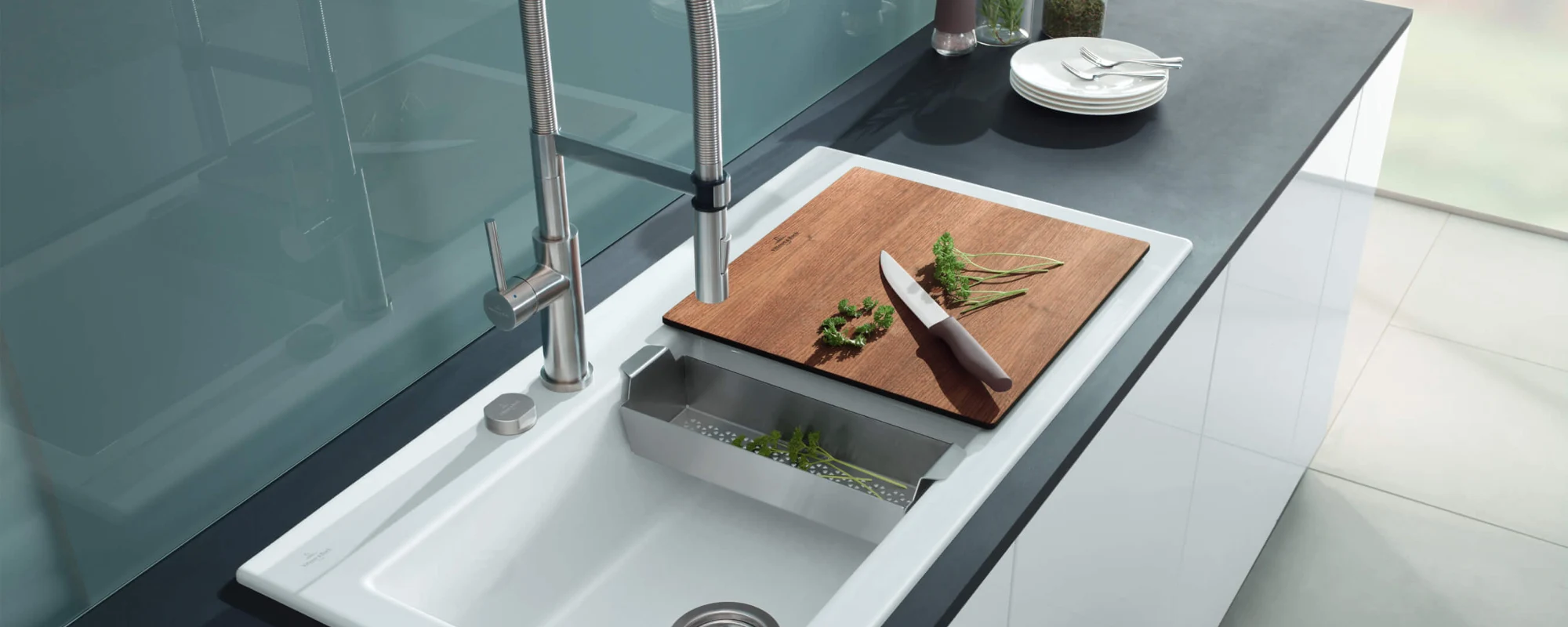 A modern kitchen sink with a high-arch tap, a wooden chopping board with chopped herbs and a knife on it and a dish rack in the sink.