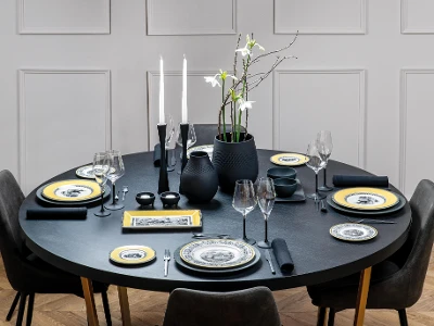 We're bringing together two of our most distinct collections—the rustic, matte black Manufacture Rock and the charmingly classic Audun—to create a tablescape that is utterly unforgettable. This dynamic pairing proves that texture and pattern, anchored by a timeless black-and-white palette, are the secret ingredients for a truly modern holiday setting.