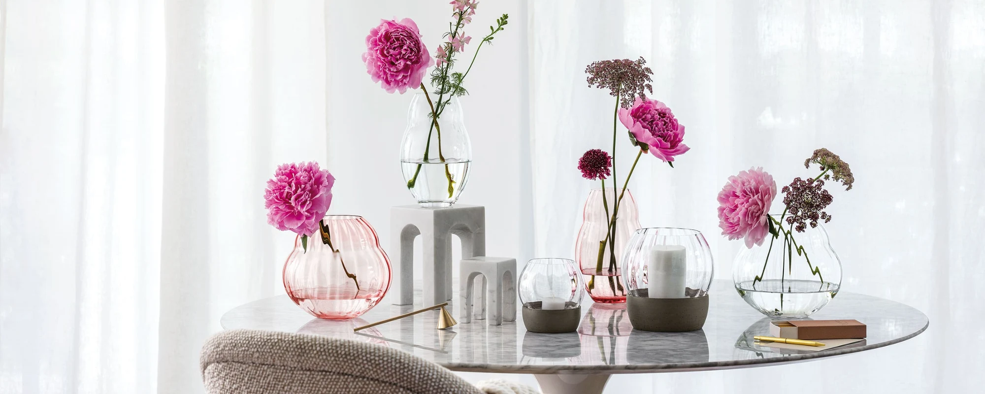A little more restraint is usually required on the kitchen table, as you still need space here for everyday dining. A practical solution is individual flowers arranged decoratively in a small vase. A pretty floral decoration displayed in a glass is a great way to brighten up your meals every day.